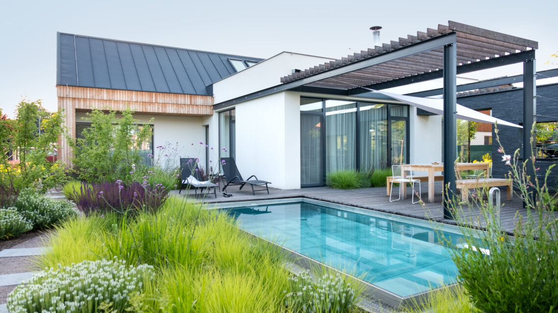 Menší městská zahrada u přízemního domu byla navržena jako harmonické spojení moderní architektury a přírodní lehkosti. Pro starší pár s mladistvým duchem vznikl prostor, který propojuje nerezový bazén a pergolu s jemnými, vzdušnými výsadbami.