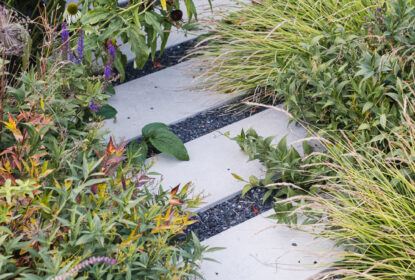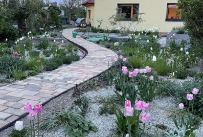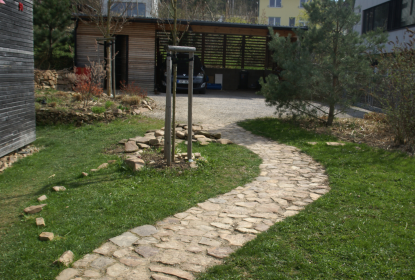Překvapení pro mne byla část o kombinování materiálů v zahradě. Vůbec by mě před kurzem nenapadlo, že by se dal hezky a vtipně vyřešit vstup na náš pozemek. Cesta pro pěší se tu totiž kříží s vjezdem pro auta. Považovala jsem situaci za neřešitelnou. A právě kombinování různých materiálů mi nabídlo řešení, z kterého mám obrovskou radost.